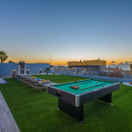 The ground floor has the fully equipped kitchen, the living room, a bathroom with washing machine and the garden with swimming pool heated all year round, a solarium with sunbeds and outdoor shower, an outdoor dining area and a relaxation area with outdoor pool. furniture.